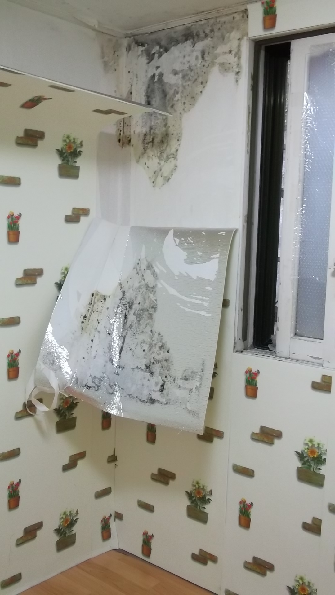 보이지만 사실은 그 단열벽지 붙인 안쪽에 곰팡이가 아주 심하다 못해 붙이지 않는곳으로